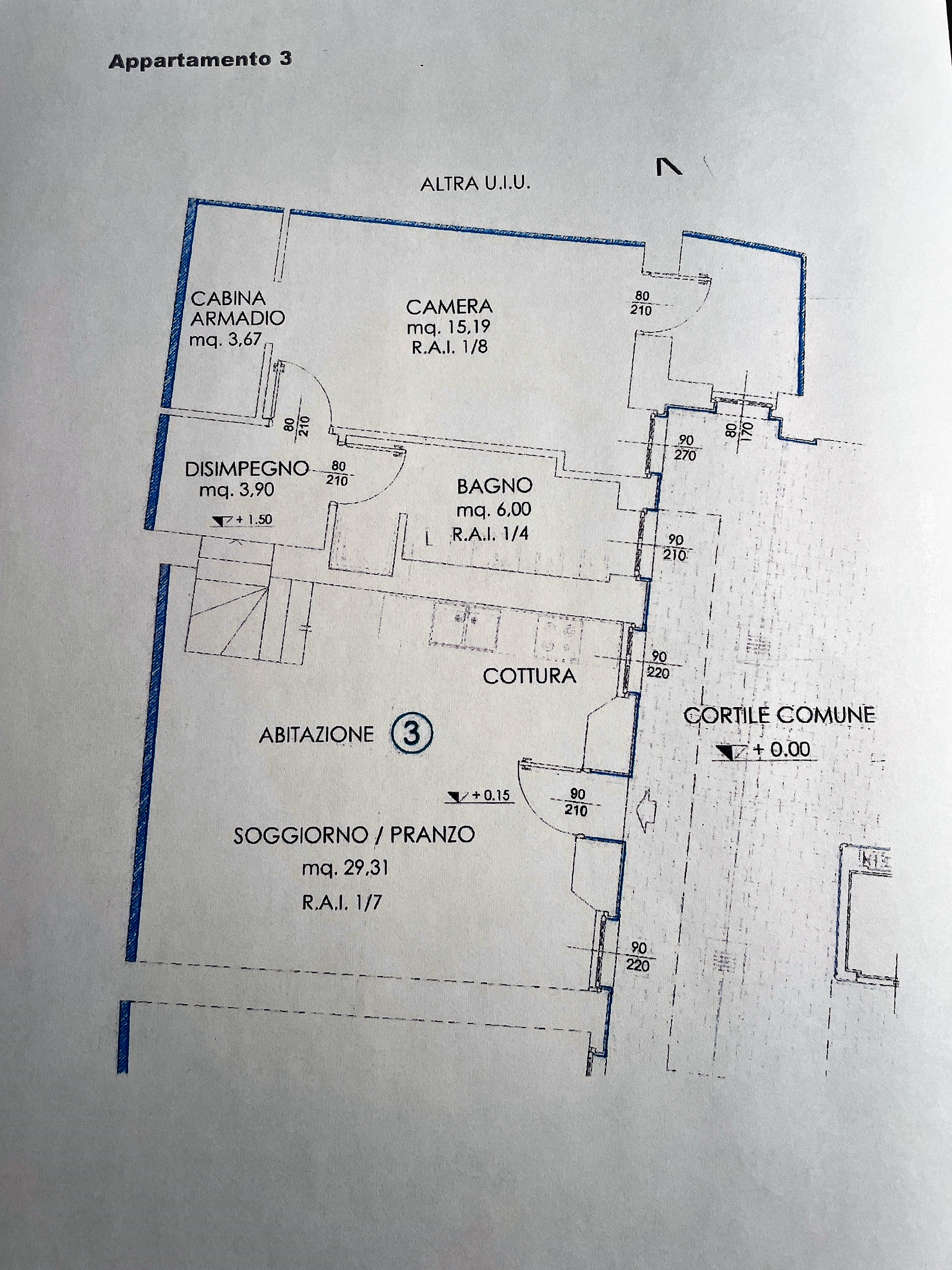 2- appartamento di mq. 80,00 composto da soggiorno con parete cottura, ripostiglio, camera da letto, cabina armadio, antibagno e bagno;